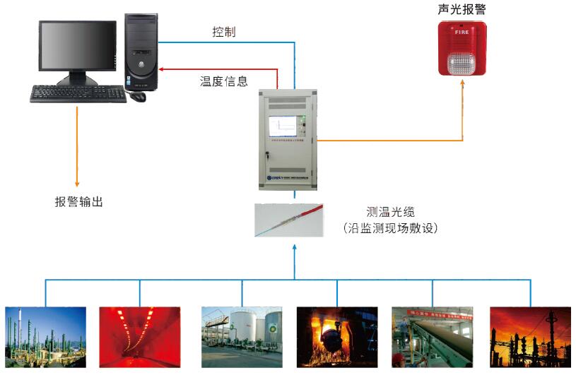 分布式光纖監(jiān)測(cè)系統(tǒng)主要是一種時(shí)域分布式光纖監(jiān)測(cè)系統(tǒng),它的技術(shù)基礎(chǔ)是光時(shí)域反射技術(shù)。其工作機(jī)理是脈沖激光器向被測(cè)光纖注入一定能量和寬度的激光脈沖,該脈沖通過(guò)光纖存在折射率的微觀不均勻性,以及光纖微觀特性的變化,有一部分光會(huì)偏離原來(lái)的傳播向空間散射,在光纖中傳輸?shù)耐瑫r(shí)不斷產(chǎn)生后向散射光波,它包括Rayleigh散射和Raman散射。 其中,后向散射光向后傳播至光纖的始端,經(jīng)耦合器、波分復(fù)用送至光電檢測(cè)系統(tǒng),檢測(cè)解調(diào)后,送入信號(hào)處理系統(tǒng)便可將溫 度信號(hào)實(shí)顯示出來(lái),并且由光纖中光波的傳輸速度和背向光回波的時(shí)間對(duì)這些信息定位。 分布式光纖監(jiān)測(cè)系統(tǒng)能夠連續(xù)測(cè)量光纖沿線所在處的溫度信號(hào),可對(duì)測(cè)量距離最大在 10 公里的范圍,空間定位精度達(dá)到 0.5米的數(shù)量級(jí),將一條數(shù)公里乃至十公里長(zhǎng)的光纖鋪設(shè)到待測(cè)空間,可連續(xù)測(cè)量、準(zhǔn)確定位整條光纖所處空間各點(diǎn)的溫 度信號(hào),通過(guò)光纖上的溫度變化來(lái)檢測(cè)出光纖所處環(huán)境變化,特別適?于需要?范圍多點(diǎn)測(cè)量的應(yīng)用場(chǎng)合。